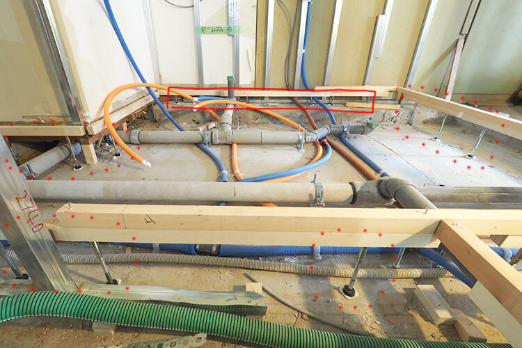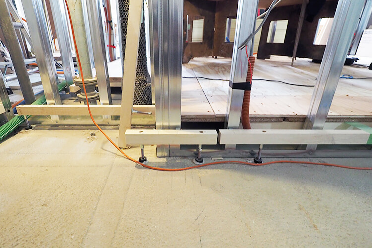 コンクリートスラブの上に、音を吸収するゴム(防振ゴム)を一定の間隔でしいていきます。ゴムは床面と接着します。ゴムに高さ調整ができるボルトがセットでくっついていて、その上にパーティクルボードを支える「システム根太(ねだ)」を置きます。そこに根太の上にパーティクルボード、構造用合板、そしてフローリング材が敷かれる、という仕組みです。