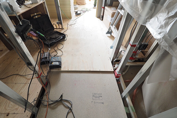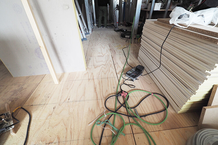 コンクリートの床(スラブ)一面に、「パーティクルボード」と呼ばれる接着剤で圧縮して固めた木の板と、その上に敷く「捨て張り用の構造用合板(コンパネ)」が敷き詰められつつありました。パーティクルボードと構造用合板(コンパネ)は、毎日の生活で直接触れる面となるフローリング(仕上げ材)の下に敷かれる床の下地です。こちらの物件は、仕上げ材のフローリングに無垢のアカシヤ材を使用するため、捨て張りの構造用合板も敷くとのことでした。
