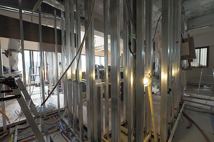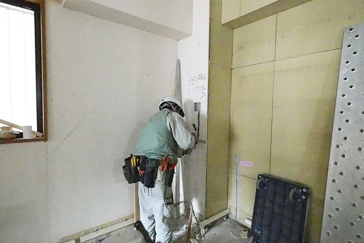 丸ノコで材料をカットしたり天井での作業など、いろんな作業が同時進行していました。