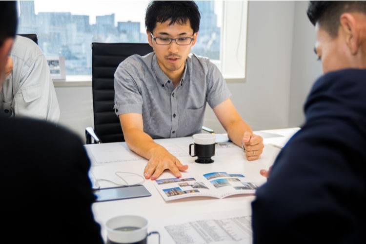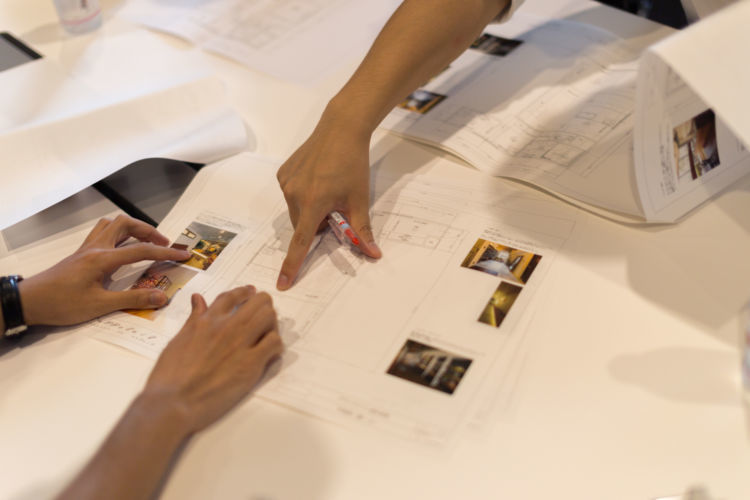 デザイナーさん(画像中央)とリノベーションの企画を打ち合わせ。今回の物件は、水回りに制約があって苦戦したのだとか……。果たしてどんなリノベーションになるのでしょうか?