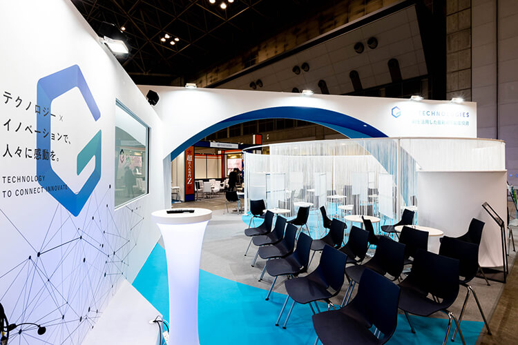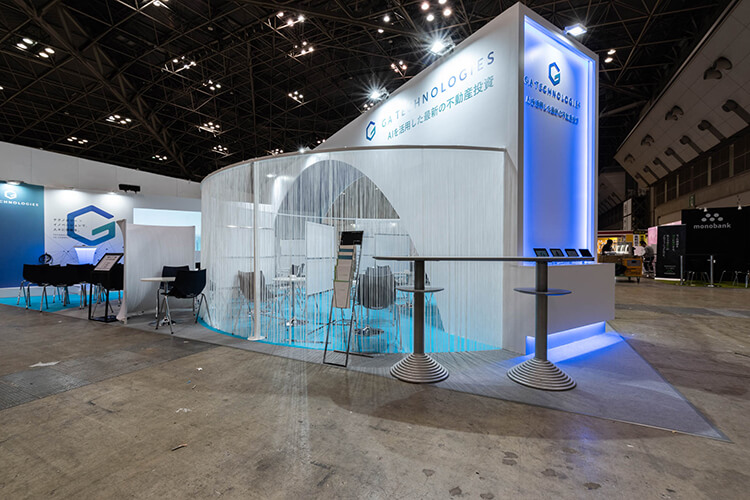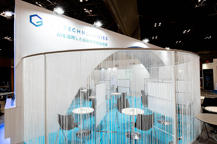 RENOSYブースは、社名「GA technologies」を全面に押し出した白と青を基調とした空間。ご来場の方に落ち着いてご相談をしていただける空間にしました。