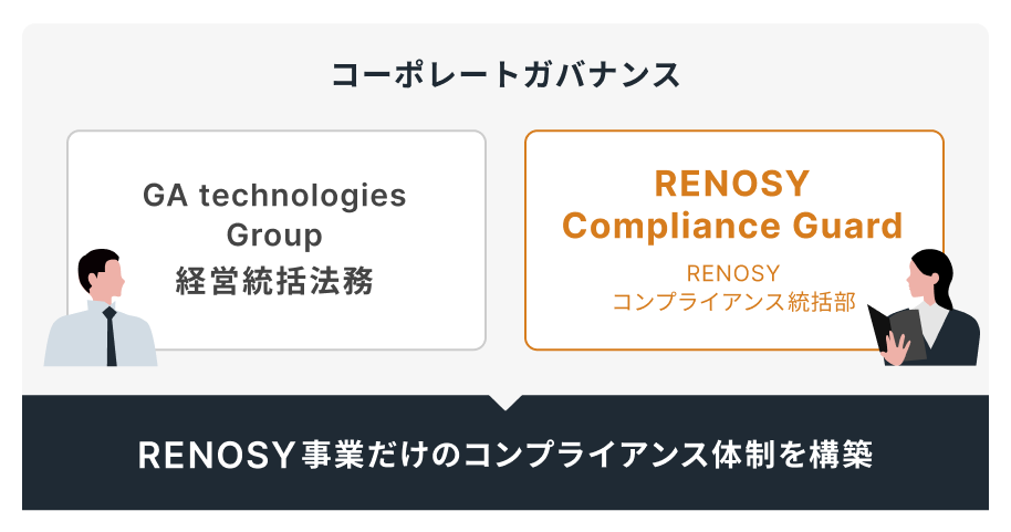 RENOSYでは、コーポレートガバナンスとは別の組織を作ることで、より事業に特化したコンプライアンス体制の強化を行っています。その中でもRENOSY Compliance Guard(RENOSY法務・コンプライアンス統括部)を設け、お客様が安心できる様なコンプライアンス遵守体制を整えるため、違反が起きない業務フローや仕組みを日々構築しています。