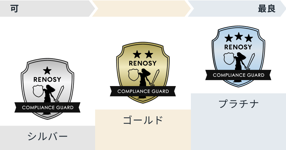上記研修の修了者には、卒業試験・出席態度・理解度等を総合評価し、三段階(プラチナ・ゴールド・シルバー)のコンプライアンスマーク「RENOSY Compliance Guard」を付与しています。